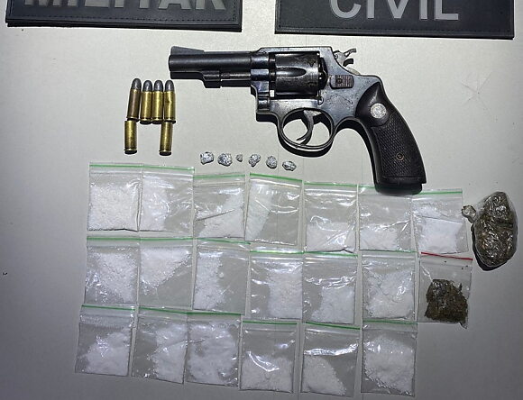 No interior da residência, as equipes apreenderam um revólver calibre .32 com seis munições — sendo duas deflagradas, uma pinada e três intactas — além de 19 papelotes de substância análoga à cocaína (aproximadamente 19g), uma porção de maconha (8,5g) e seis pedras de crack (1g).